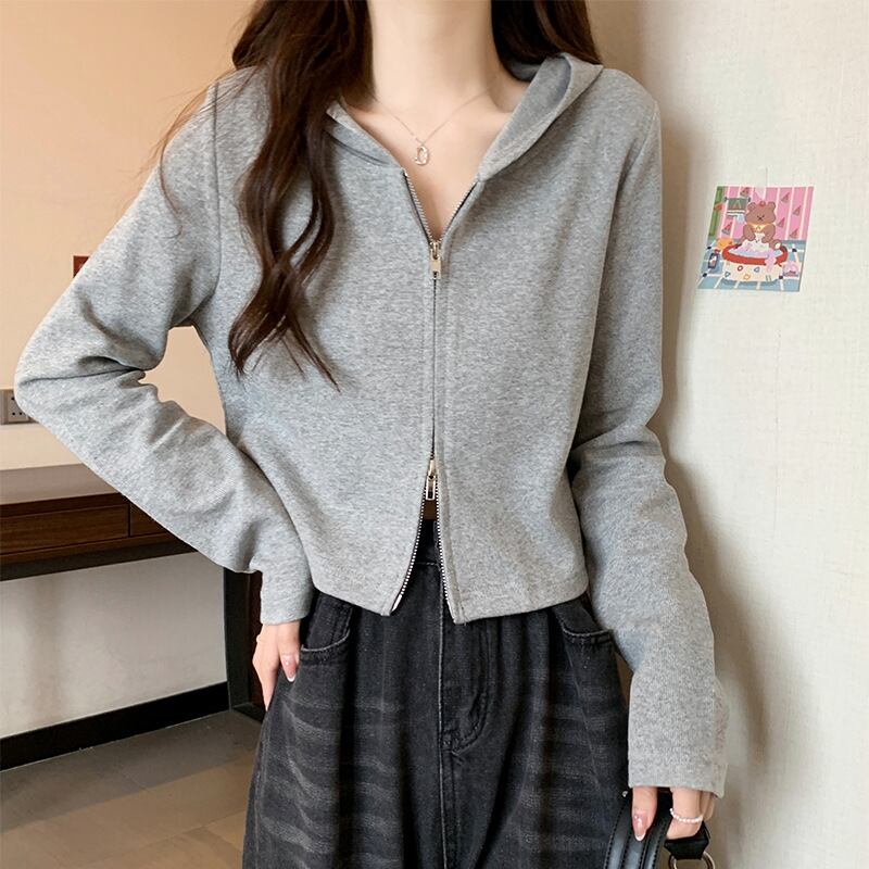 フェミニンな雰囲気とカジュアルさを兼ね備えたフード付きパーカー、レディースカーディガンダブルジッパートップ。