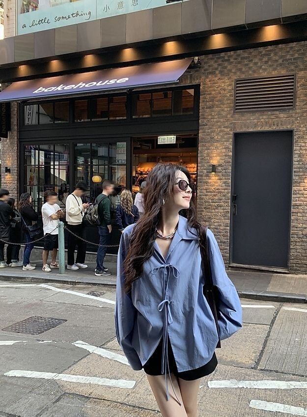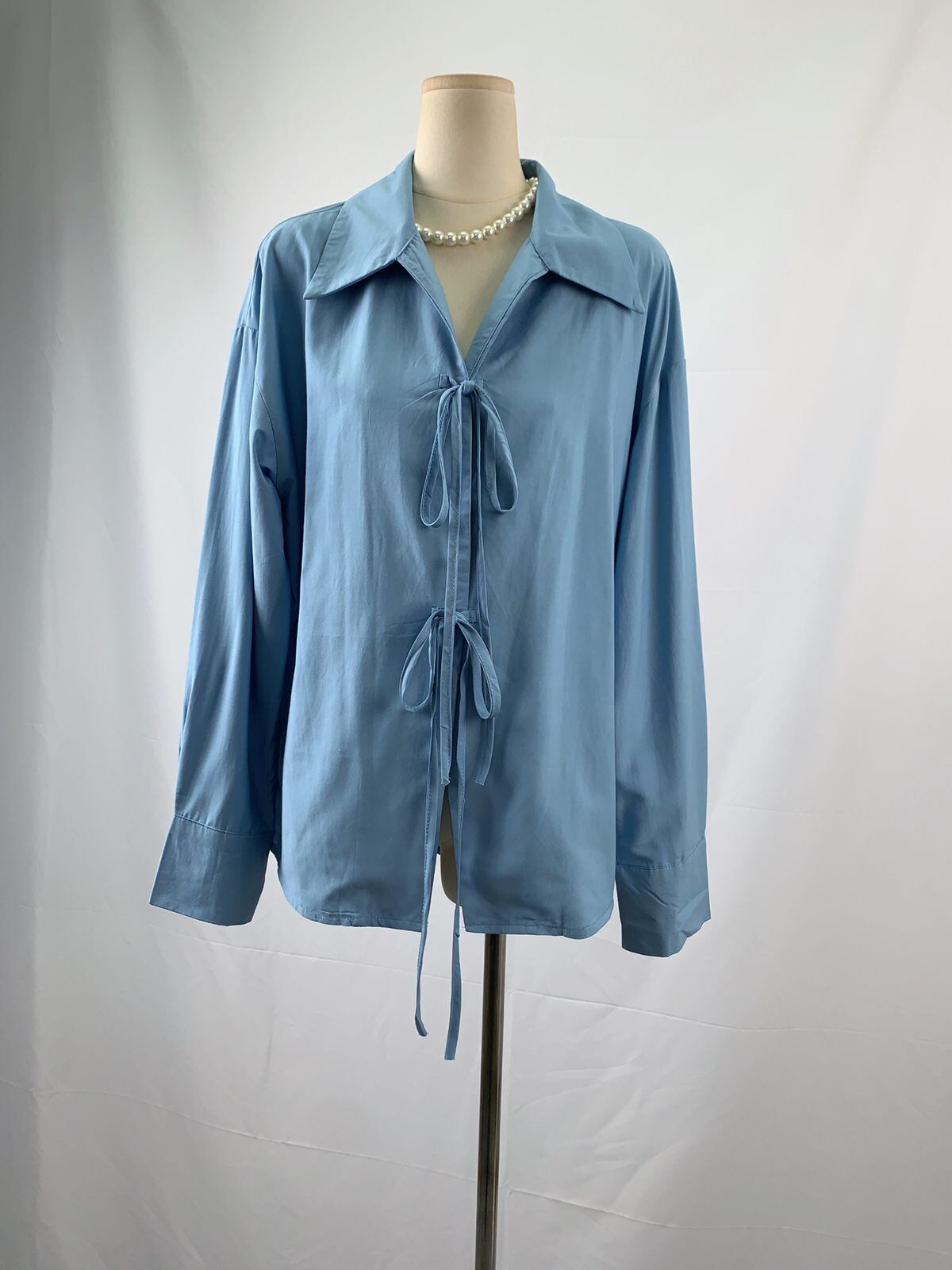 結びデザインが特徴的で、可愛らしさをプラスした一着。ゆったりとしたシルエットで、カジュアルにも、きれいめにも幅広いシーンで活躍します。爽やかなブルーの色合いが、コーディネートに明るさを添えてくれます!